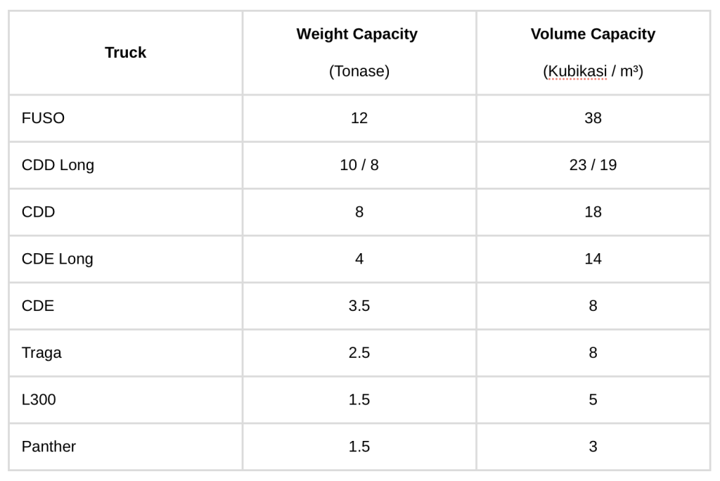 PT. Soekiman Poetra Perkasa menyediakan truck dengan dimensi dan tonase yang berbeda-beda.